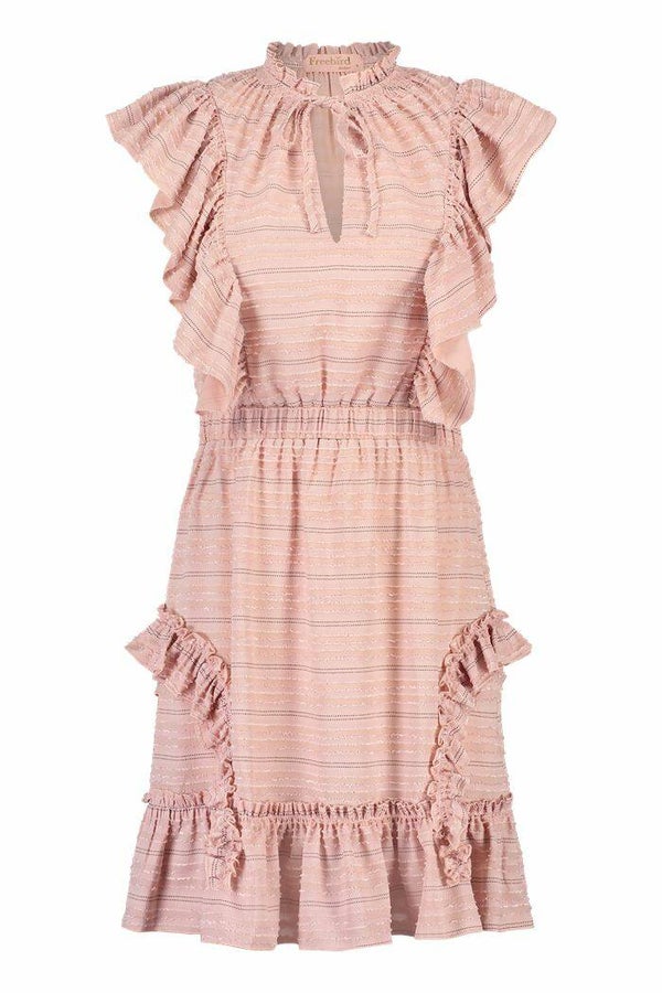 De Adela jurk van Freebird is een perfecte jurk voor de lente. De jurk heeft een zachtroze kleur met een streepprint. Verder heeft de jurk korte mouwen, ruches, een elastiek om de taille te accentueren en een kraag die met touwtjes kan worden gesloten. Combineer deze jurk met sandalen overdag en hoge hakken voor een perfecte avondlook.